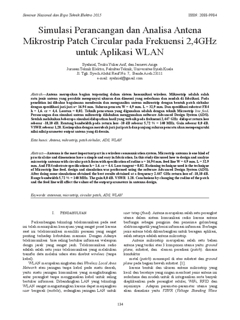 Simulasi Perancangan Dan Analisa Antena Mikrostrip Patch Circular Pada Frekuensi 2,4Ghz Untuk Aplikasi Wlan